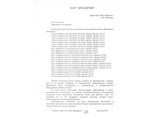 Результаты испытаний абразивных материалов организацией ООО "ДРЕВПРОМ".