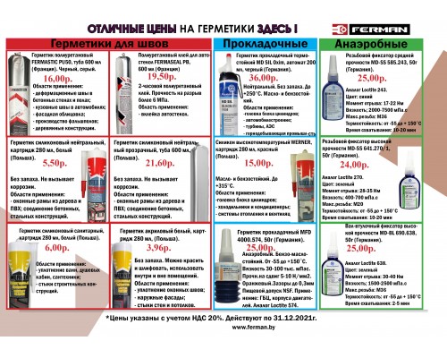 ООО "Фэрман" предлагает широкий спектр герметиков самых разных назначений от ведущих европейских производителей MARSTON-DOMSEL GmbH (Германия), EMFI SAS (Франция), SELENA Sp.z o.o. (Польша). Учитывая большой ассортимент герметиков и клеев, мы включили в листовку (ниже) только самые популярные из них.